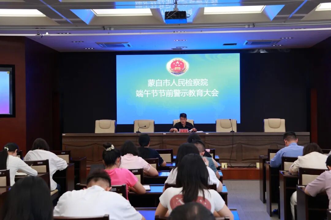 端午假期将至,为贯彻落实中央八项规定精神及其实施细则精神,推动作风建设常态化长效化,营造廉洁、安全、文明、节俭的过节氛围,6月3日,蒙自市人民检察院召开端午节节前警示教育大会。党组成员、政治部主任李周叁主持会议,全体干警参加会议。