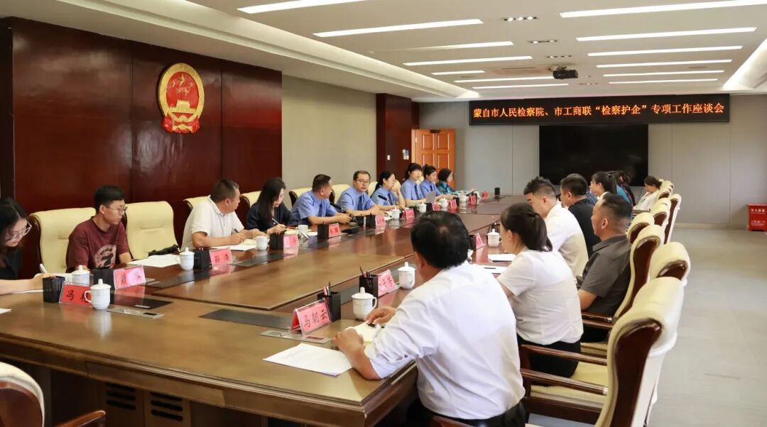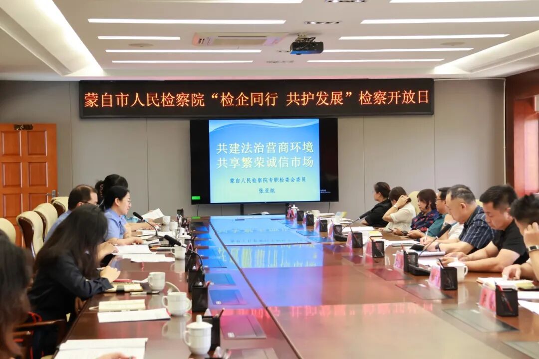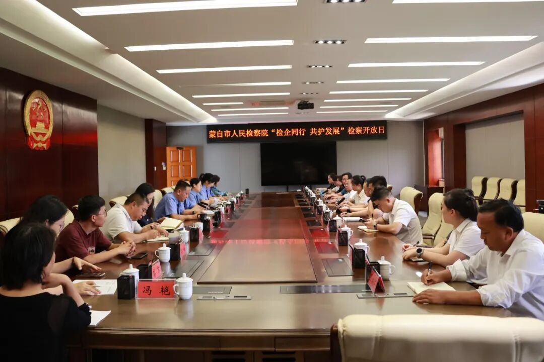 为贯彻落实最高检关于“检察护企”专项行动工作部署,增进社会各界和人民群众对检察机关开展法治化营商环境工作的了解和支持,进一步服务保障法治化营商环境。6月13日,蒙自市人民检察院邀请市工商联、市市场监督管理局相关人员以及市人大代表、市政协委员、市人民监督员、企业代表走进检察机关,开展“检企同行、共护发展”主题检察开放日活动暨“检察护企”专项行动工作座谈会。
