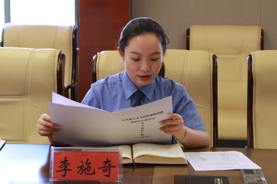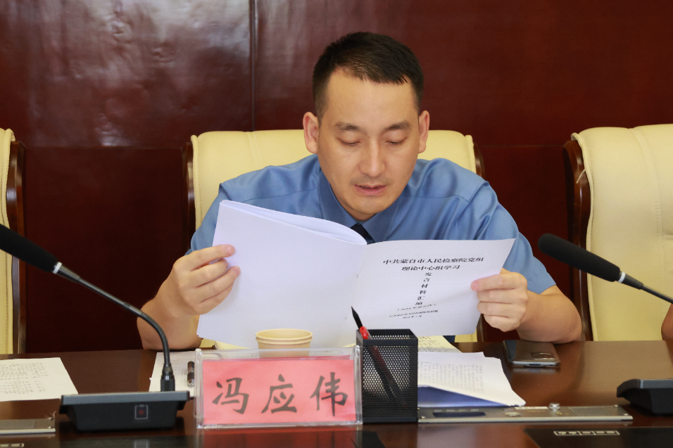 在前期潜心自学的基础上,大家围绕学习主题,立足检察工作实际,进行了交流研讨。党组副书记、副检察长冯应伟,第一检察部副主任罗旭芬,第一检察部副主任谭昕怡,第二检察部副主任李施奇四位同志进行了重点发言。
