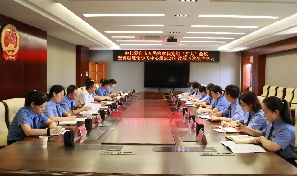 7月26日,蒙自市人民检察院举行党组(扩大)会议暨党组理论学习中心组2024年度第五次集中学习,市检察院班子成员、检委会专职委员、部门负责人、员额检察官参加学习。党组书记、检察长毛雪峰主持会议。