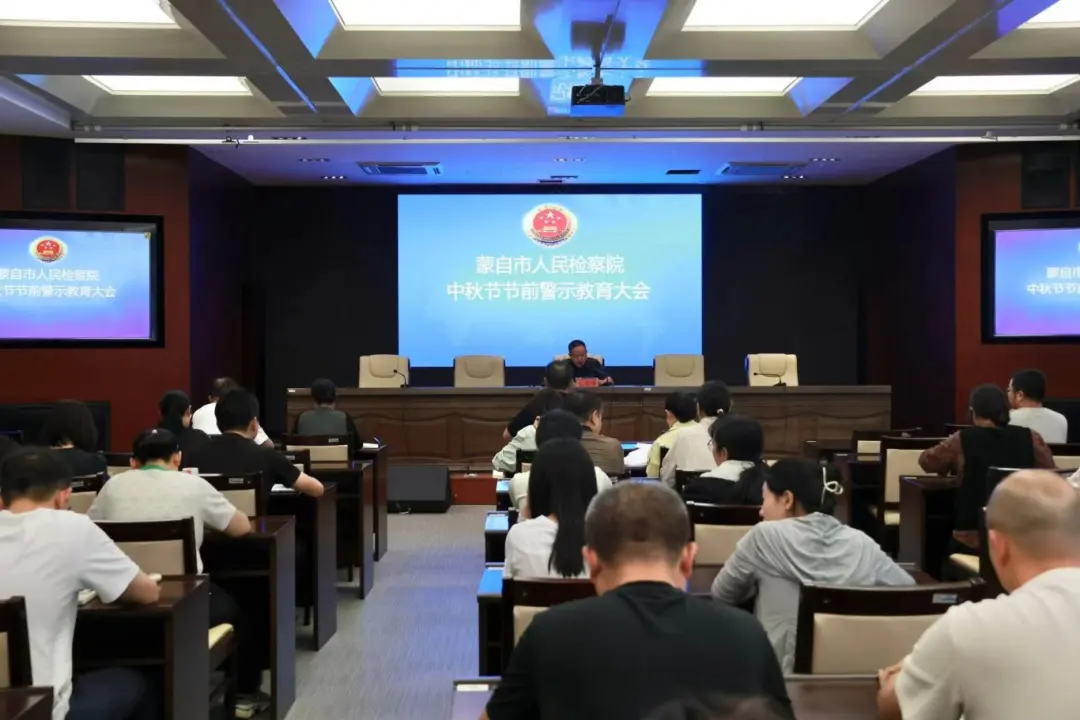 中秋将至,为进一步巩固深化党纪学习教育成果,深入贯彻落实中央八项规定及其实施细则精神,筑牢干部职工廉洁自律防线,营造风清气正的节日风气。9月14日,蒙自市人民检察院召开中秋节节前警示教育大会。党组书记、检察长毛雪峰主持会议。