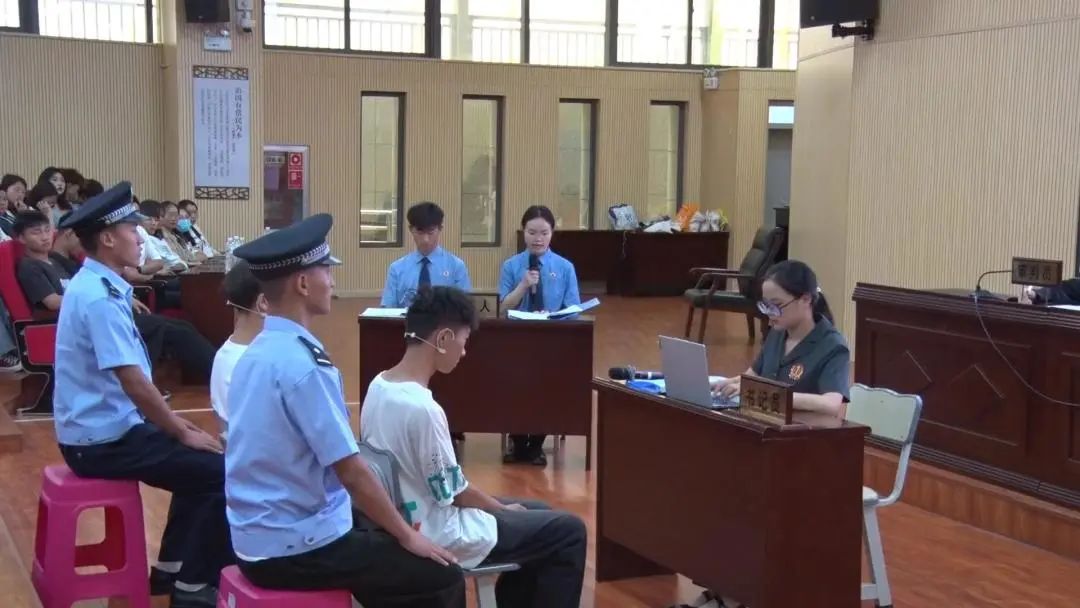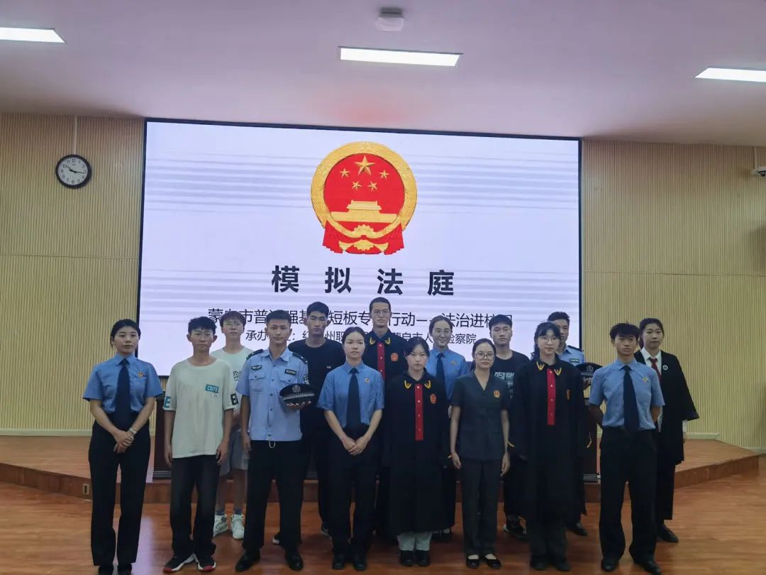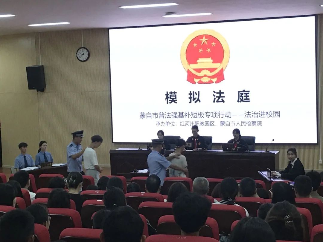 近年来,电信网络诈骗犯罪案件及其关联犯罪案件在学生群体中呈上升趋势,为进一步增强在校学生的法治意识和自我保护意识,维护校园安全,为法治宣传更具针对性、实效性。2023年6月15日,蒙自市人民检察院联合红河州职教园区开展“法治进校园”之模拟法庭法治教育活动。省、州普法工作队指导组成员以及蒙自市人民检察院检察长毛雪峰亲临现场指导,职教园区300余名学生现场观摩,现场通过直播、录播的方式实现蒙自校区与建水分校全覆盖进行宣传。