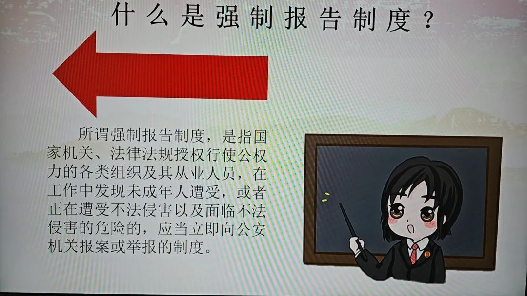 近日,我院未检干警刘玥赴老寨苗族乡向全体教师开展普法宣传,详细解读了《未成年人保护法》和强制报告制度内容,从未成年人保护的重要意义等方面阐明了强制报告制度的出台背景、现实价值,并结合典型案例向教职工详细介绍“谁来报告”“向谁报告”“哪些情形需要报告”等内容,重点强调了不履行强制报告义务的法律后果,解决当地乡政府、教师“不知道怎么报告”“大事化小小事化了”的问题,扫除强制报告制度的理解“盲区”。