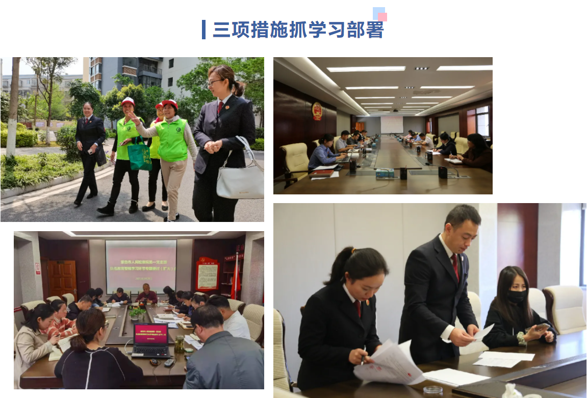 二是结合党史教育。精心组织开展党史学习教育,把党史学习教育作为‘必修课’,坚持规定动作不走样,自选动作有创新,激发干警干事创业、履职担当的内生动力。