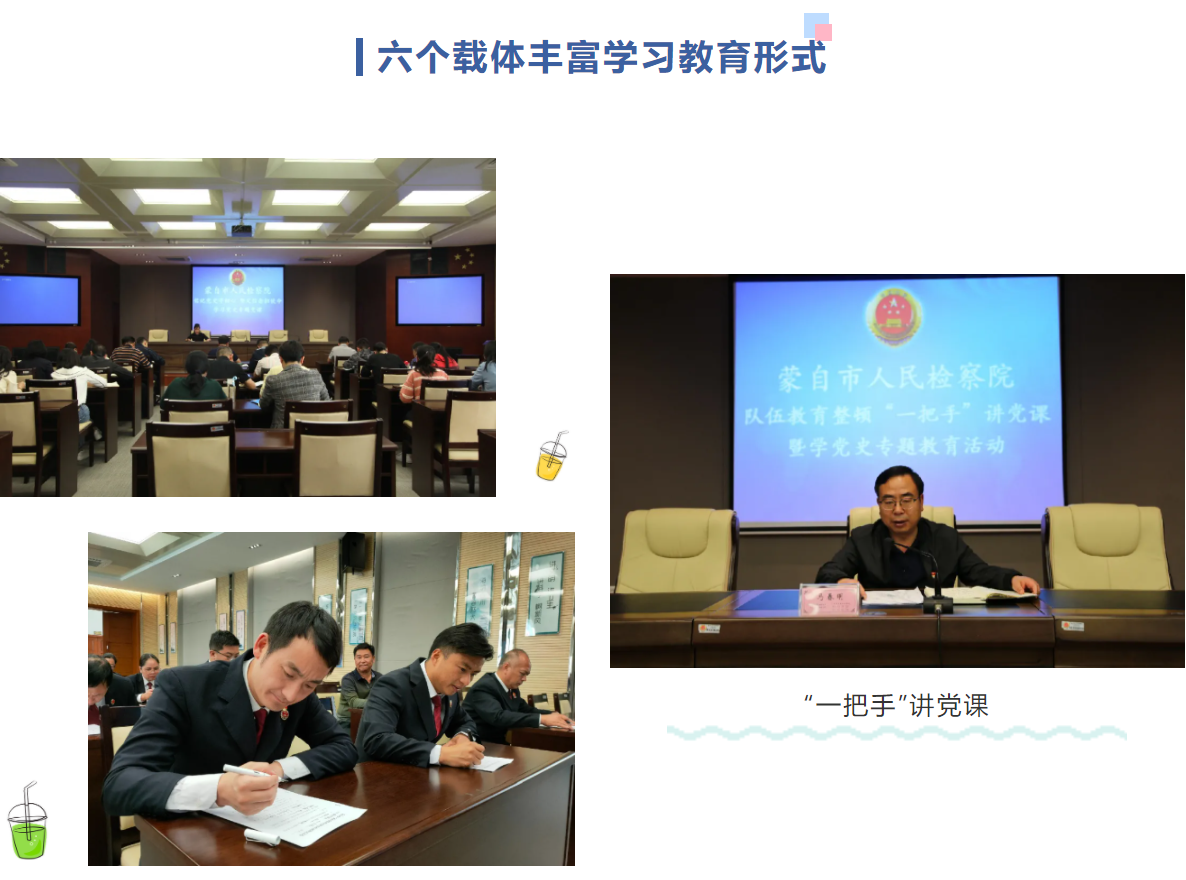 二是开展领导小组成员讲党课活动。结合学习内容,制定蒙自市人民检察院教育整顿领导小组成员讲党课计划安排表,结合工作实际和自己的学习心得,面向全体干警上专题党课,以讲促学鼓干劲。目前,已开展讲党课活动3期。