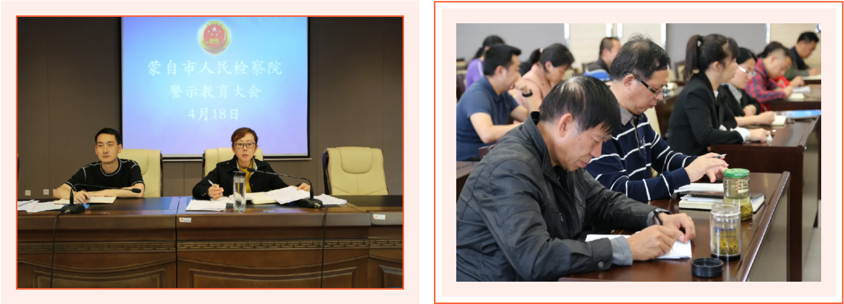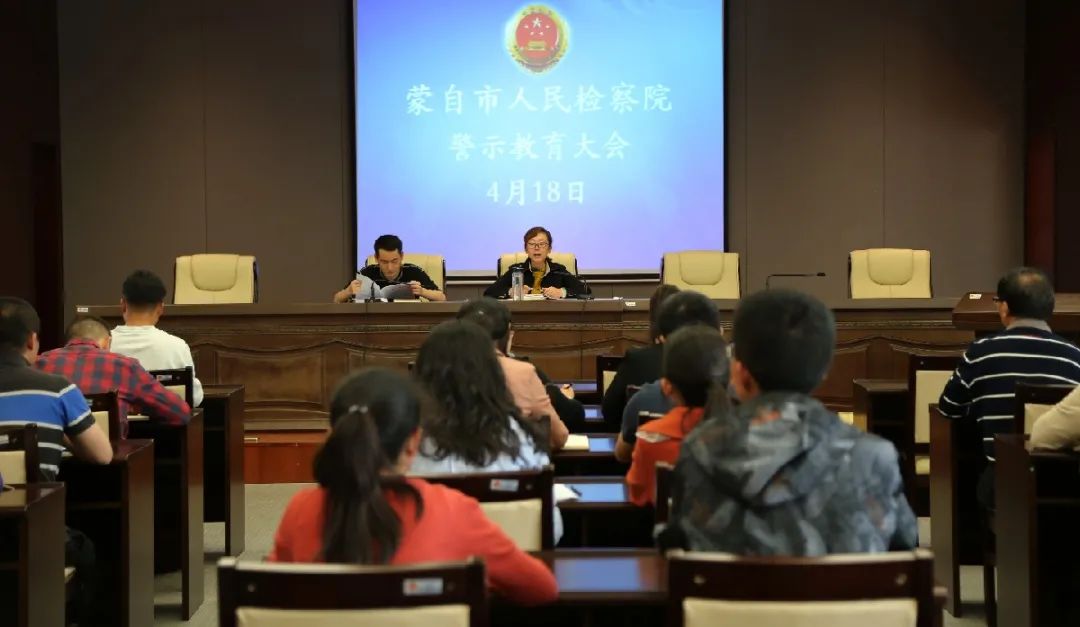 为扎实推进政法队伍教育整顿查纠整改环节工作,通报典型案例,用身边的事教育身边的人,讲解“自查从宽、被查从严”政策,让检察干警受到警示和教育,促使干警打开心结、放下包袱,激发干警进行自查自纠的内生动力,4月18日下午,蒙自市人民检察院召开警示教育大会,深入开展警示教育工作,全体干警参加了会议。