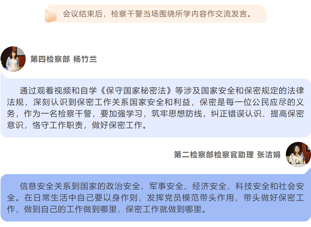 会上,分管保密工作副检察长黄敏带领全院干警学习了《中华人民共和国保守国家秘密法》的有关规定,对国家秘密的密级、保密期限、知悉范围、涉密文件的管理、网络保密及保密基层实施的使用进行了详细的讲解,她要求全院干警在实际工作中要学以致用,严格遵守《中华人民共和国保守国家秘密法》的规定,筑牢保密思想防线,将“保密工作无小事”的意识落实到工作的方方面面。