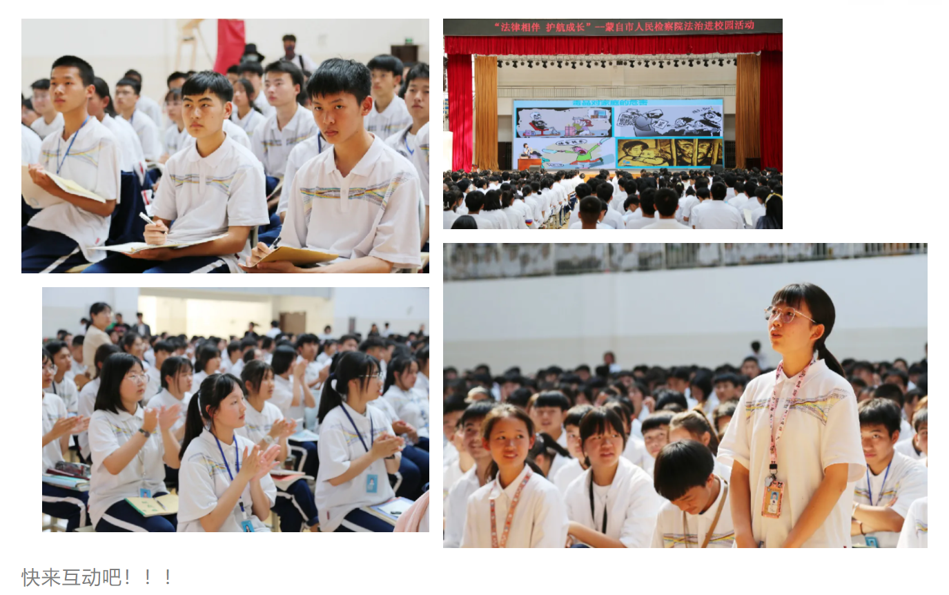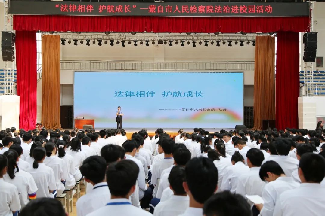 为进一步提高未成年人用法、守法意识,增强法治观念,蒙自市人民检察院以“我为群众办实事”为契机,开启“法律相伴,护航成长”法治进校园活动,4月23日,蒙自市人民检察院走进蒙自市第四中学,为全校高一、高二年级1500余名师生讲授了一堂生动有趣的法治课。