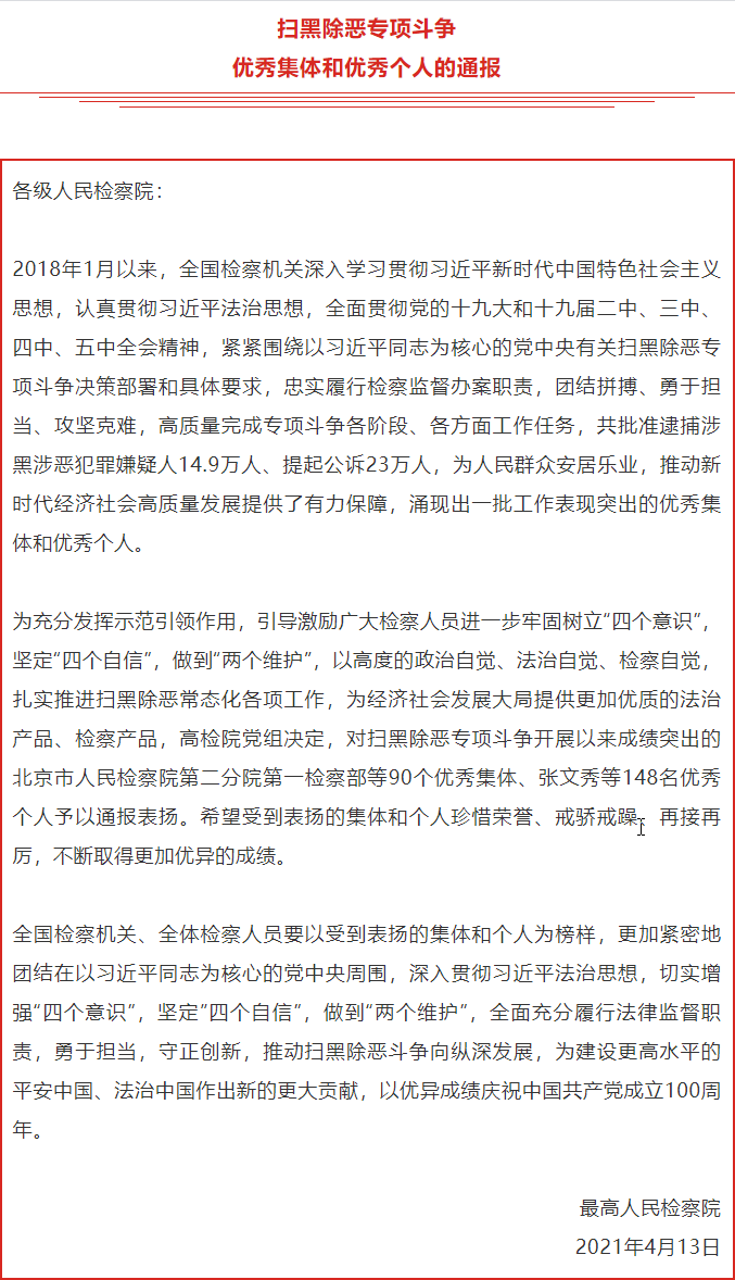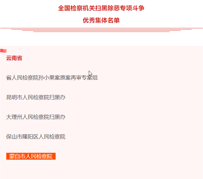 近日,最高人民检察院下发了《关于表扬全国检察机关扫黑除恶专项斗争优秀集体和优秀个人的通报》,对扫黑除恶专项斗争开展以来成绩突出的90个优秀集体、148名优秀个人予以通报表扬。其中,蒙自市人民检察院脱颖而出,被最高检表扬!