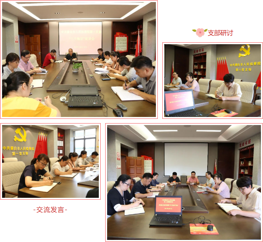 6月16日下午,蒙自市人民检察院第一、第二党支部分别以支部为单位的形式召开“三个规定”专题学习研讨会,全体党员及干警参加学习。各党支部书记分别领学“三个规定”及检察系统违反“三个规定”的典型案例,全体党员、干警对近期学习“三个规定”的理解、感悟进行深入交流研讨,分享心得体会。