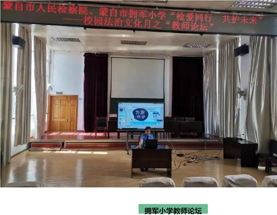 在“检爱同行,共护未来”校园法治文化月期间,法治副校长们分别在蒙自市拥军小学、华清中学、蒙自市老寨乡倮厄小学、蒙自市老寨乡中心小学组织开展全体教职工对“一号检察建议”的再学习,及学习《关于建立侵害未成年人案件强制报告制度的意见(试行)》,明晰学校及教职员工对未成年人的保护职责。