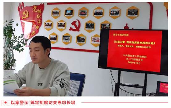 为进一步推进党史学习教育和政法队伍教育整顿成果巩固,加强党支部规范化建设,2021年10月29日下午,蒙自市人民检察院党组成员、副检察长冯应伟为检察院第二党支部全体党员干警,讲授了一堂主题为《以案警示筑牢拒腐防变思想长堤》的廉政党课。