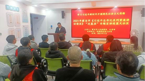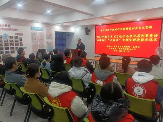 在蓝天社区的会议室里,40余名社区工作人员、居民一起聆听了精彩的宣讲。宣讲中,毛雪峰紧紧围绕《习近平总书记系列重要讲话读本》,为广大干部群众全面准确阐述习近平总书记系列重要讲话的重大意义、科学内涵、精神实质和实践要求,阐述了讲话提出的一系列重大战略思想和重大理论观点。