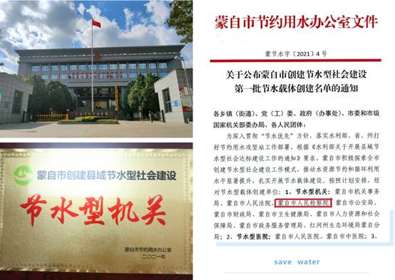 近日,蒙自市节约用水办公室、蒙自市水利局联合印发文件,决定授予全市9家机关单位 为第一批市级节水型机关,蒙自市人民检察院喜获“节水型单位”荣誉称号。