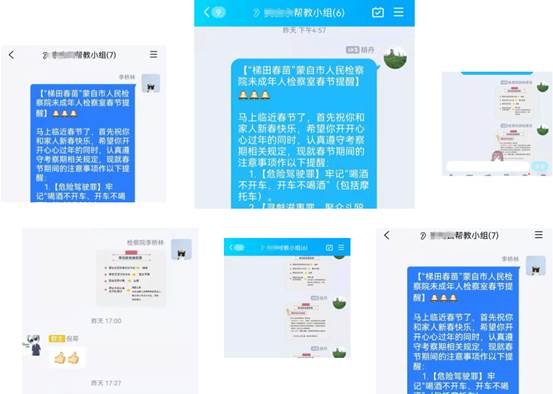 近日,“梯田春苗”蒙自未检在新春佳节到来之际,通过线上线下相结合的方式,联合司法社工组织对附条件不起诉考察期内的未成年人及其监护人进行节前提醒。