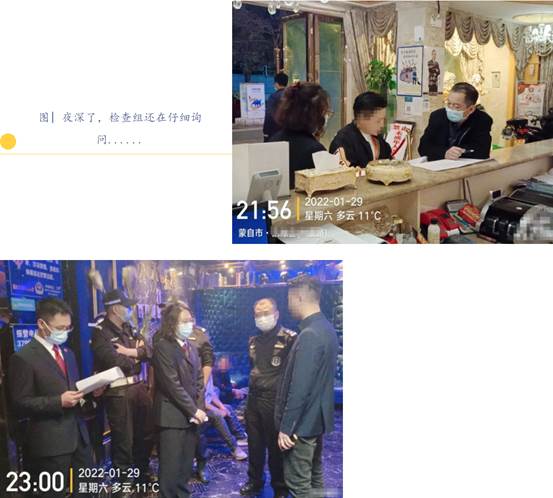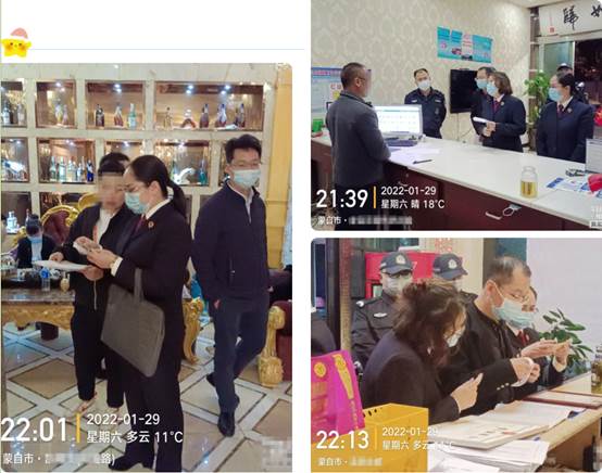 在学生放假、春节来临之际,1月29日,蒙自市人民检察院牵头联合蒙自市公安局、蒙自市文化和旅游局、蒙自市人力资源和社会保障局等部门,对全市重点区域内营业性娱乐场所、酒吧、宾馆、互联网上网服务营业场所开展预防侵害未成年人合法权益专项检查。