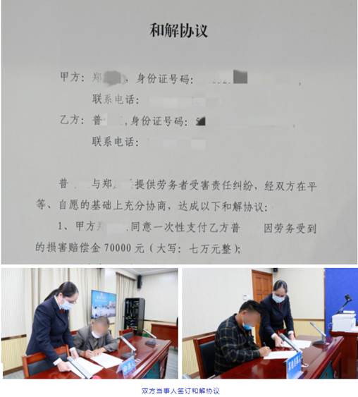 听证会上,办案检察官介绍了基本案情和拟支持起诉的理由,围绕听证目的、赔偿金额等问题展开了讨论,并就案件事实、法律适用、社会效果等方面阐述支持起诉观点,双方当事人也充分阐述了各自观点和诉求。经检察官释法说理,双方当事人一致同意在检察机关的主持下进行和解,由郑某某一次性赔偿普某某劳务损害赔偿金70000元,当场签订《和解协议书》,并以现金方式全额支付。