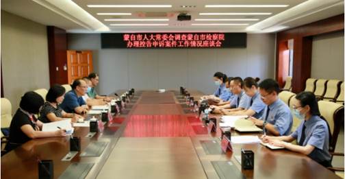 8月18日下午,蒙自市人大常委会副主任李运良带领调查组一行5人到蒙自市人民检察院对控告申诉案件办理工作情况开展调研。市检察院党组书记、检察长毛雪峰,党组成员、副检察长黄敏及第五检察部全体成员参加调研座谈。
