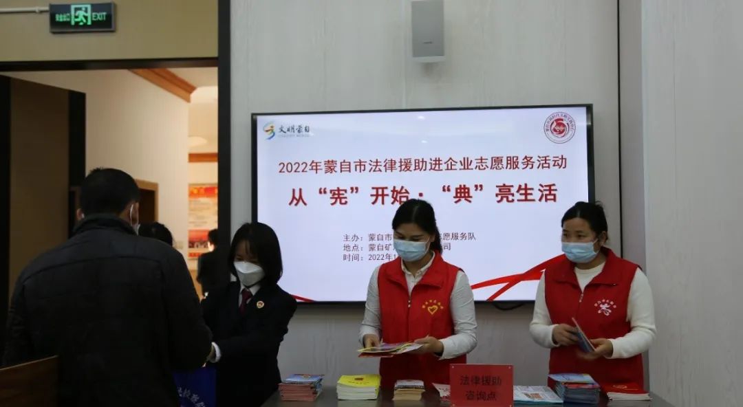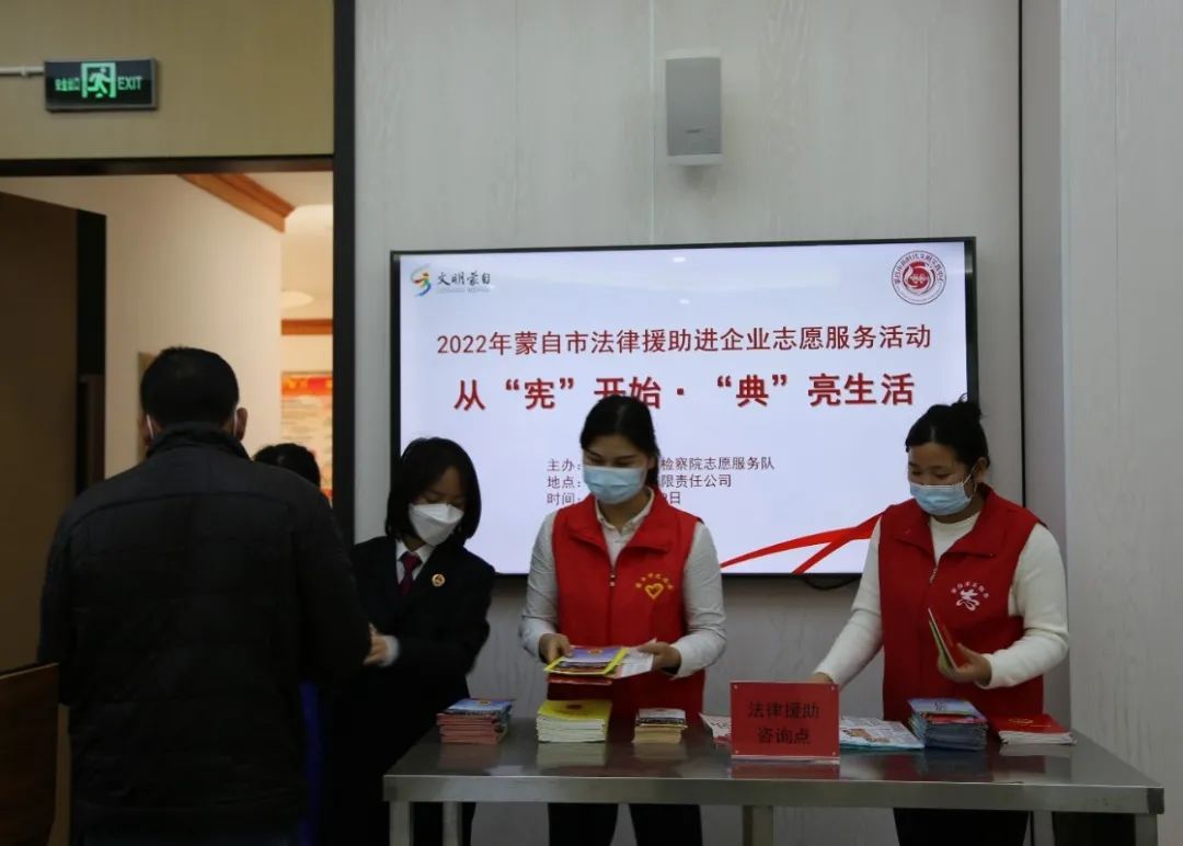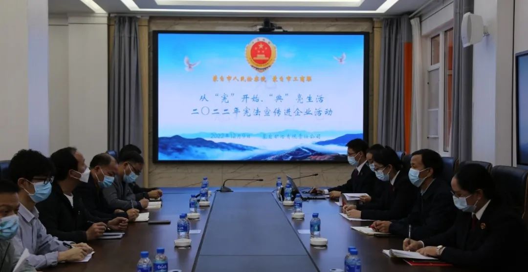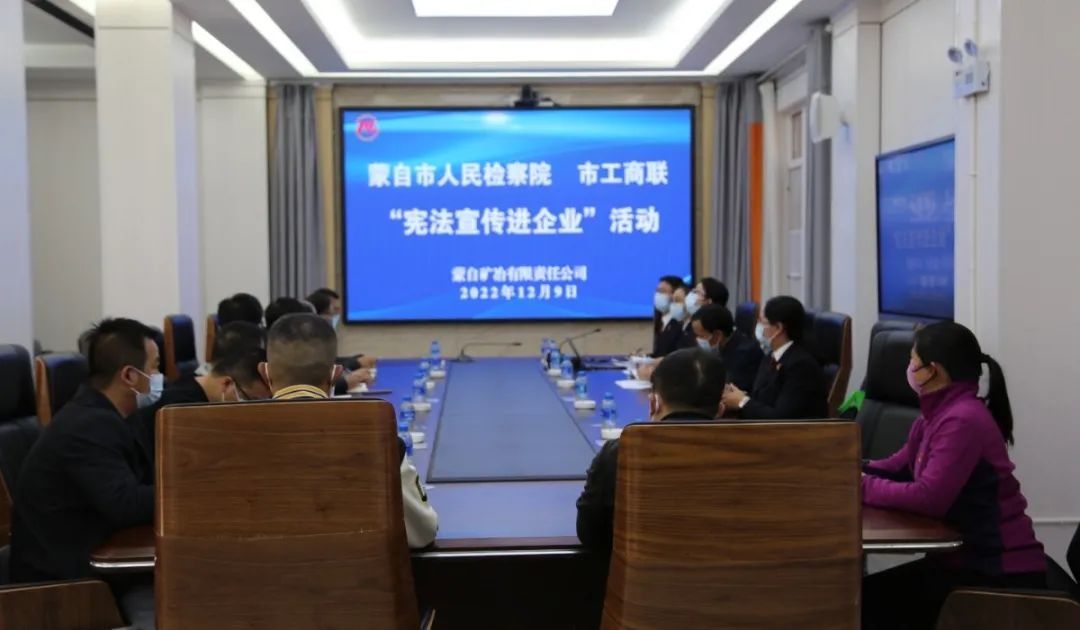 为进一步学习贯彻党的二十大精神,不断增强群众的宪法意识和法治观念,积极履行检察机关护航民营企业相关职能。12月9日,蒙自市人民检察院联合市工商联走进蒙自矿冶有限责任公司,开展“从‘宪’开始·‘典’亮生活”宪法宣传进企业活动。矿冶公司部分党员干部职工参加活动