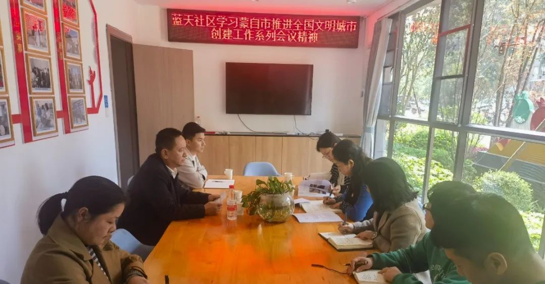 会上,毛雪峰检察长向蓝天社区传达了蒙自市创建第七届全国文明城市暨未成年人思想道德建设工作汇报会、九届州委常委会第58次会议关于全国文明城市创建工作精神的传达提纲、2023年蒙自市创建第七届全国文明城市决战决胜动员大会暨工作部署会会议精神。并针对蓝天社区在创建全国文明城市工作中存在的问题,进行了下一步安排部署,强调了创城工作的紧迫性,要求社区按照职责进一步细化工作任务,压实责任,全力以赴完成测评各项任务,确保创城工作取得好的成效。
