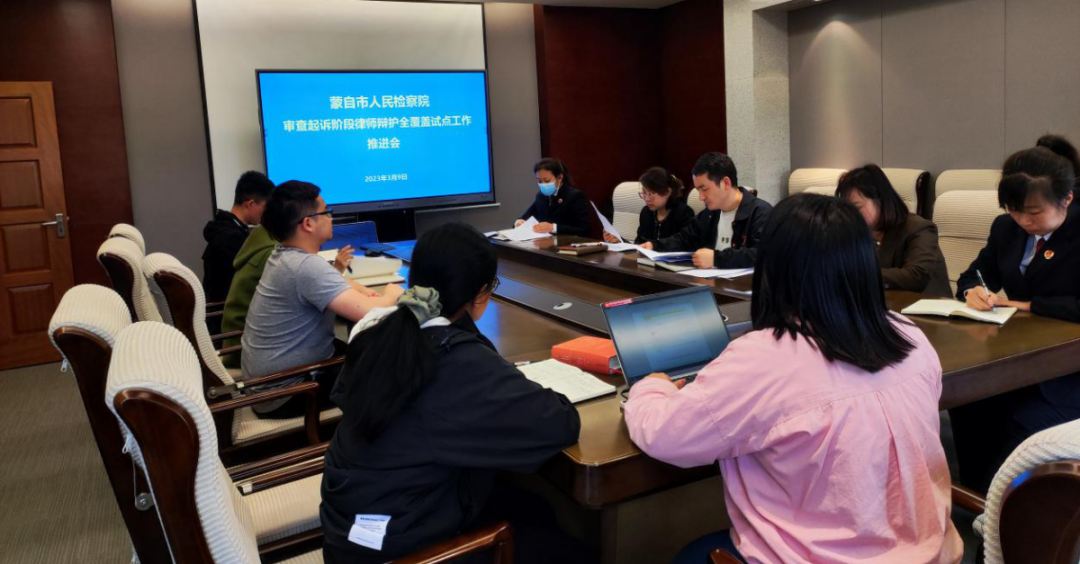 为深入贯彻最高人民法院、最高人民检察院、公安部、司法部联合出台的《关于进一步深化刑事案件律师辩护全覆盖试点工作的意见》,进一步加强刑事案件犯罪嫌疑人人权司法保障,切实保障被告人的合法权益。蒙自市人民检察院于2023年3月9日与市司法局召开座谈会,就先行开展审查起诉阶段律师辩护全覆盖工作进行了细致的研究会商。我院分管副检察长冯应伟、市司法局副局长杨勇及试点工作联络员参加会议。