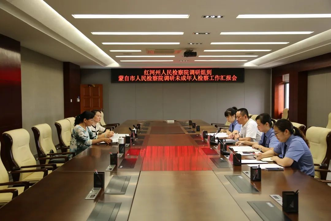 6月20日下午,红河州人民检察院副检察长张玲、第九检察部主任陈思夷一行莅临蒙自市人民检察院调研指导未检工作。蒙自市人民检察院党组书记、检察长毛雪峰,党组成员、副检察长黄敏,第二检察部干警参加调研座谈。