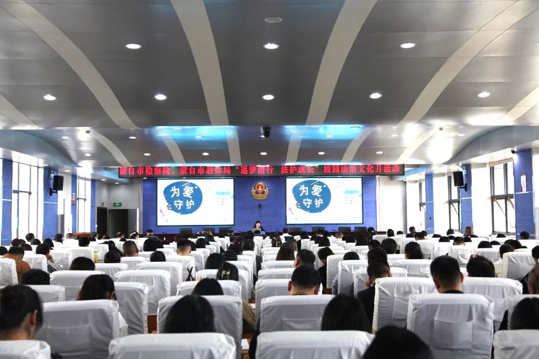 2023年10月23日上午,为深入推进全市预防未成年人违法犯罪工作,促进教师师德师风建设,提升教师法律素养,筑牢未成人保护前沿防线,蒙自市人民检察院联合市教体局开展了“逐梦前行 法护成长”校园法治文化月活动。