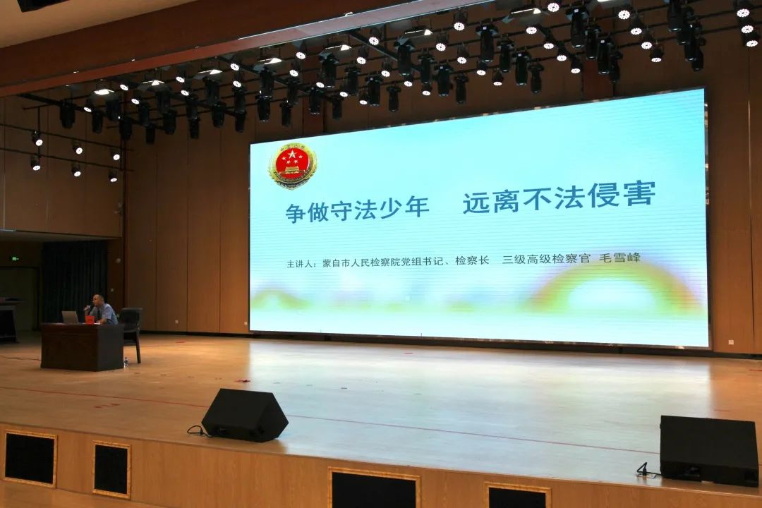 为进一步加强新时代校园法治建设,共同构建和谐平安的校园环境,增强学生的法治观念、提高安全意识,2023年10月27日,蒙自市人民检察院党组书记、检察长毛雪峰到蒙自市崇德学校开展“逐梦前行,法护成长”校园法治文化月活动专题法治课宣讲。
