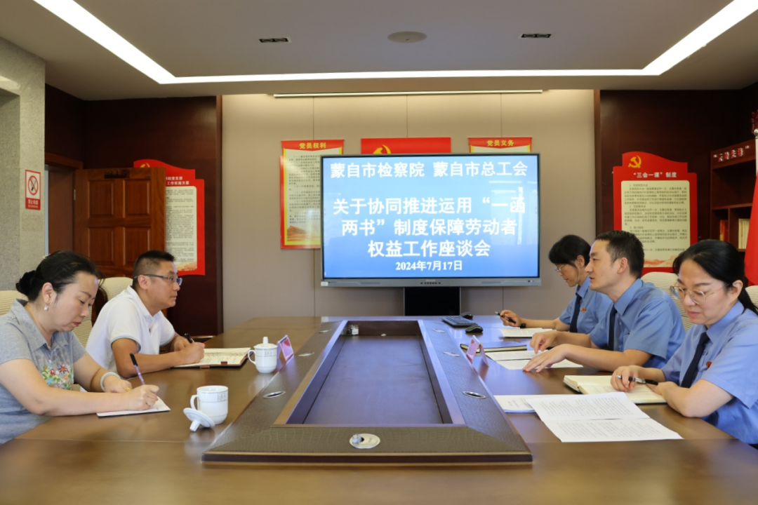 为深入落实最高人民检察院、中华全国总工会《关于协同推进运用“一函两书”制度保障劳动者权益工作的通知》要求,充分发挥检察机关与工会在维护劳动者合法权益、构建和谐劳动关系中的协同作用。7月17日,蒙自市人民检察院与蒙自市总工会就协同推进运用“一函两书”制度保障劳动者权益等工作召开座谈会。蒙自市总工会副主席张龙、市总工会劳经部部长王尧羽,市检察院副检察长冯应伟和第四检察部相关人员参加会议。