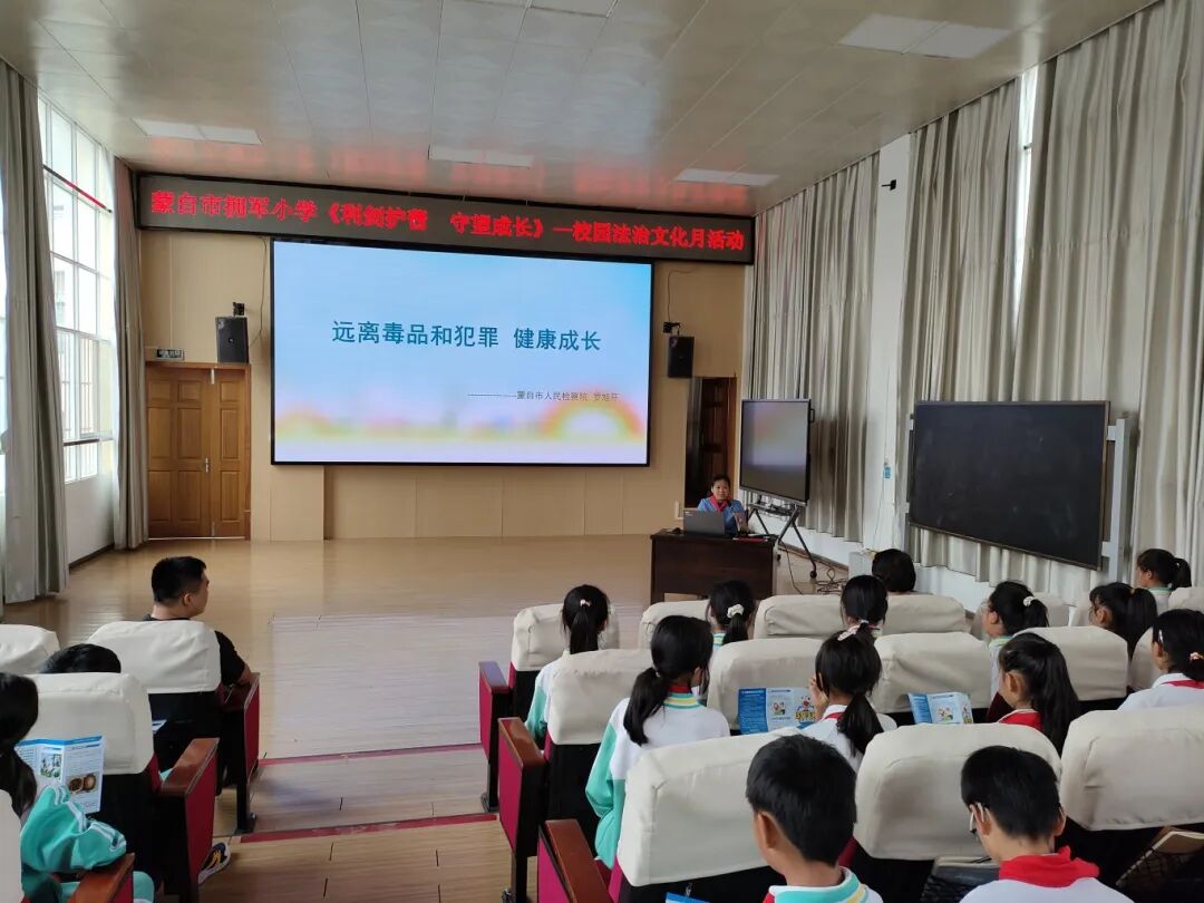 为深入推进禁毒宣传工作,切实提高未成年人对抵制毒品侵害和自我保护能力,营造文明和谐友善的校园环境。近日,蒙自市人民检察院第一检察部副主任罗旭芬以法治副校长的身份走进蒙自市拥军小学,用心、用情地为全校师生上了一堂以“远离毒品和犯罪 健康成长”为题的法治课。
