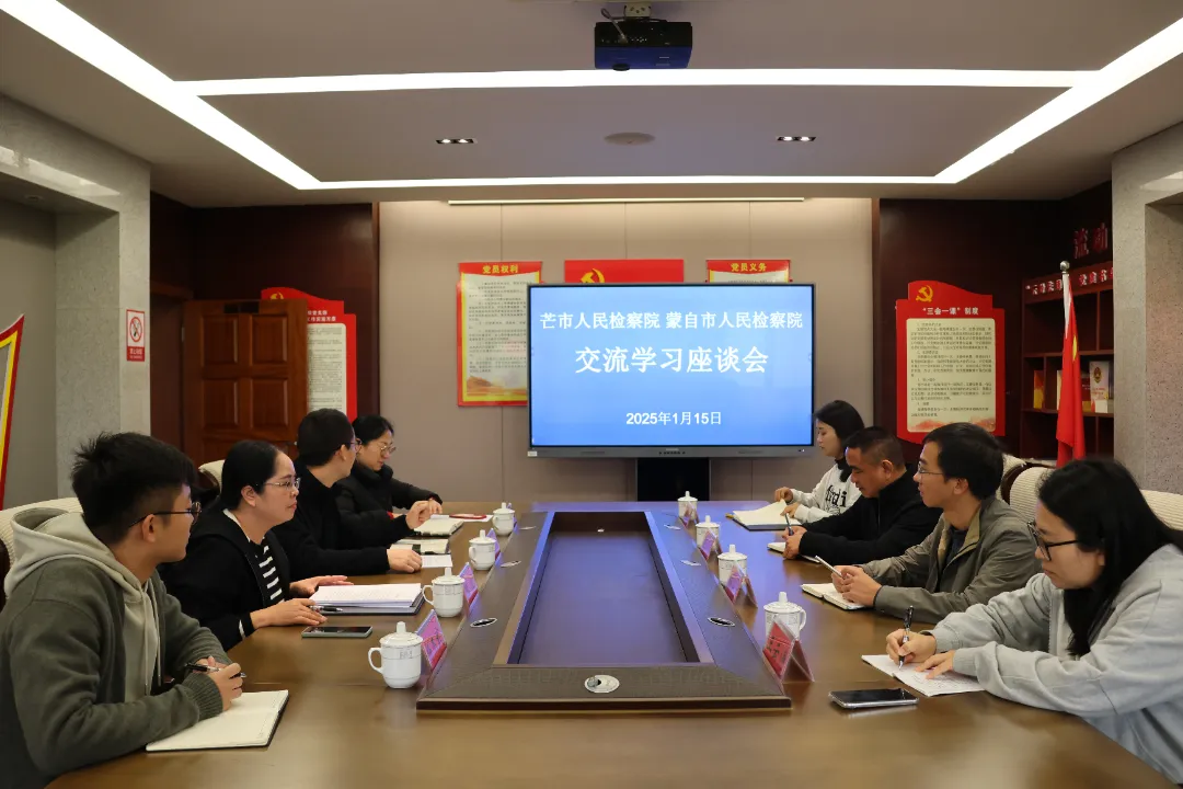 1月15日,芒市检察院副检察长李本才率队到蒙自市检察院就民事、行政、公益诉讼工作进行座谈交流。蒙自市检察院党组副书记、副检察长冯应伟及第四检察部全体干警参加座谈。