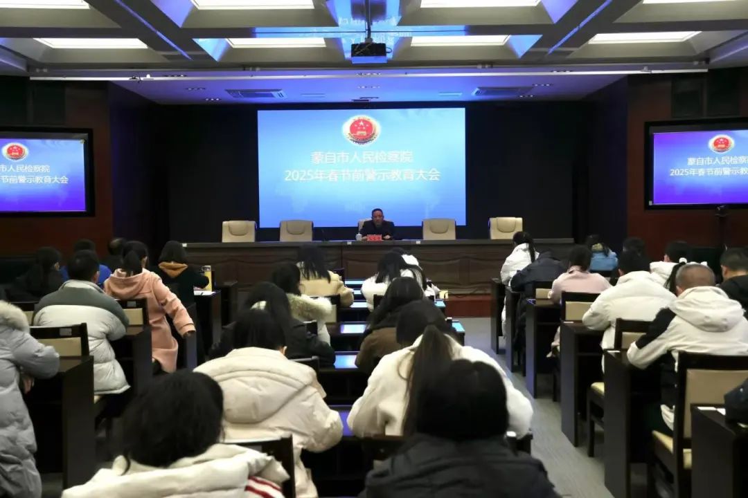 为持续深化纪律作风建设,进一步营造风清气正的节日氛围,确保全院干警文明过节、廉洁过节、安全过节,1月26日,蒙自市人民检察院召开春节前警示教育大会,党组书记、检察长毛雪峰主持会议,全体干警参会。