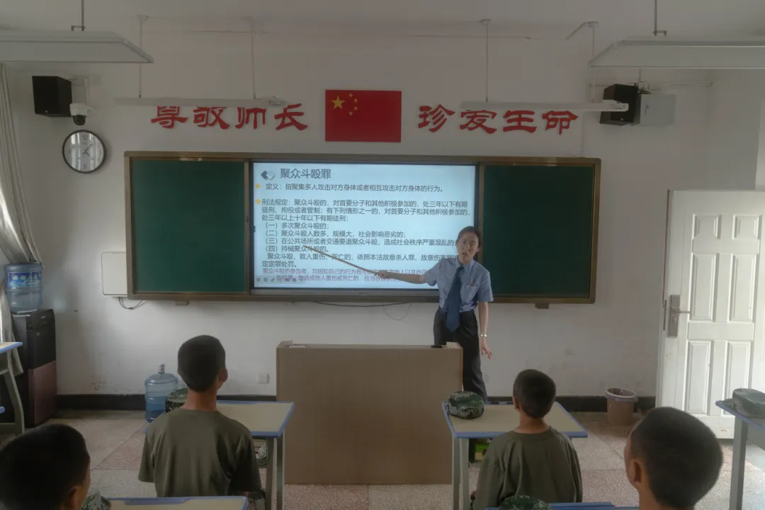 当天的课堂上,未检干警围绕“法为何物?”“犯罪那些事”“人生规划”三个方面,借助故意伤害、聚众斗殴、盗窃等典型案例深入剖析、以案释法,教导同学们学会敬畏法律、约束自身,并与同学们进行互动,引导他们思考人生的选择问题。