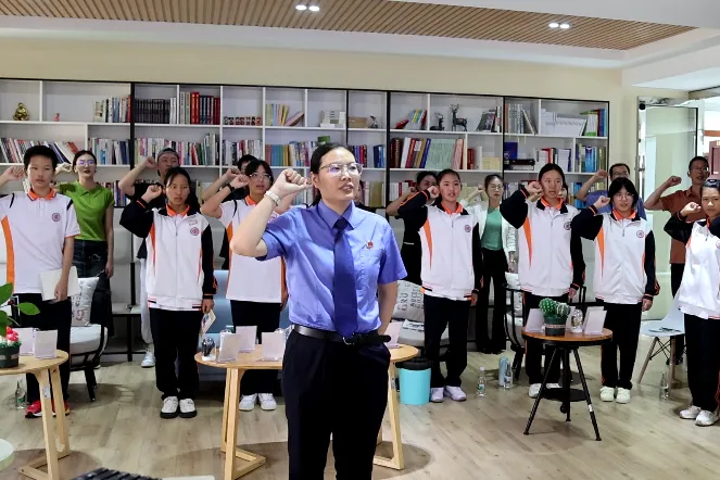 “我是中华民族的儿女,我永远不会忘记毒品给我们国家和民族带来的伤害……”在检察官的带领下,全体人员高举右拳,庄严宣誓。铿锵有力的誓言回荡在会场,表达了大家共同抵制毒品、守护未成年人健康成长的坚定信念。师生代表纷纷表示,宣誓不仅是一份承诺,更是一份责任,将在今后的学习和生活中积极践行。