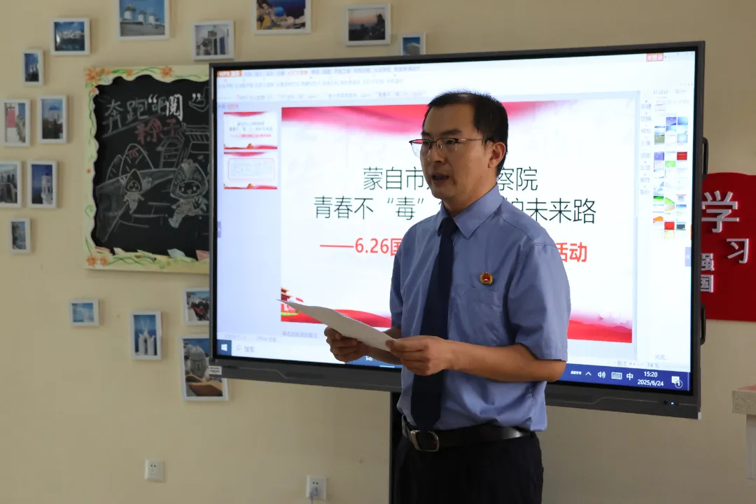 蒙自市人民检察院副检察长郭祥龙通报了2025年未成年人检察工作情况,通过剖析校园欺凌、网络诈骗等典型案件,深入浅出地讲解了未成年人常见违法犯罪行为的法律后果和社会危害。