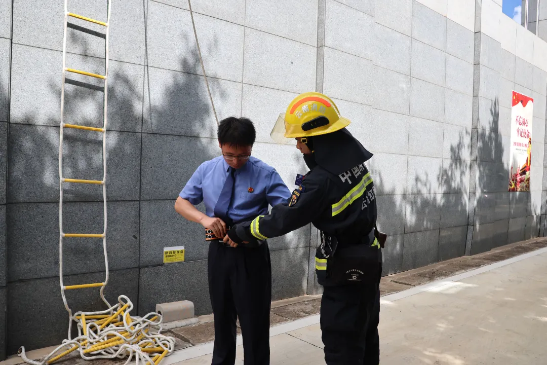随后,消防员对防烟面罩、消防软梯等逃生装备进行了教学讲解,重点演示了软梯逃生中,软梯的固定方法、攀爬下撤动作和缓降节奏等要领,并邀请干警进行体验。