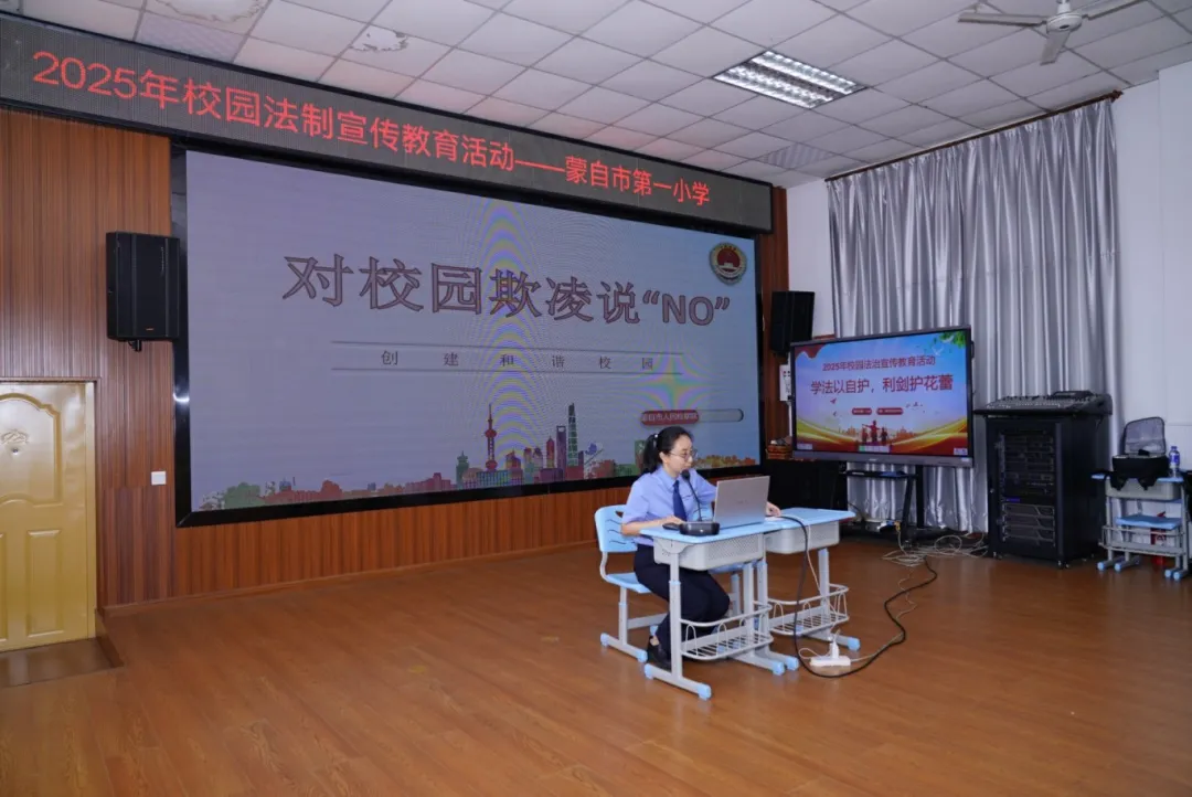 在蒙自一小,未检干警以 “对校园欺凌说‘NO’” 为主题,结合小学生的年龄特点和认知水平,通过讲述真实案例、互动问答等形式,让同学们直观地了解校园欺凌的表现形式,包括肢体欺凌、语言欺凌、社交欺凌和网络欺凌等,用通俗易懂的语言详细讲解校园欺凌的危害,不仅会对受害者的身体和心理造成双重伤害,施暴者也将承担相应的法律责任。