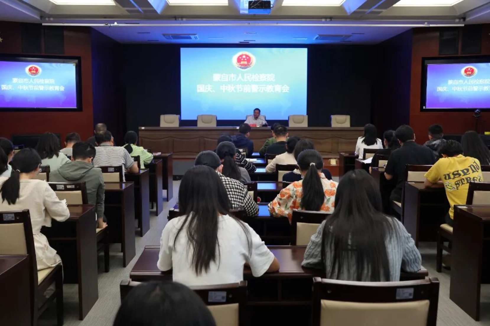 国庆与中秋双节将至,为深入贯彻落实中央八项规定及其实施细则精神,持续深化党风廉政建设,营造风清气正、廉洁祥和的节日氛围,9月29日,蒙自市人民检察院召开国庆、中秋节前警示教育会。会议由党组书记、检察长毛雪峰主持。全院干警参加会议。