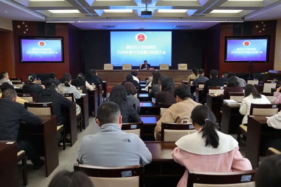 新春将至,年味渐浓。为深入贯彻落实中央八项规定及其实施细则精神,引导全院干警知敬畏、守底线,2月13日,蒙自市人民检察院召开春节前警示教育大会。院党组书记、检察长毛雪峰主持会议。全院干警参会。