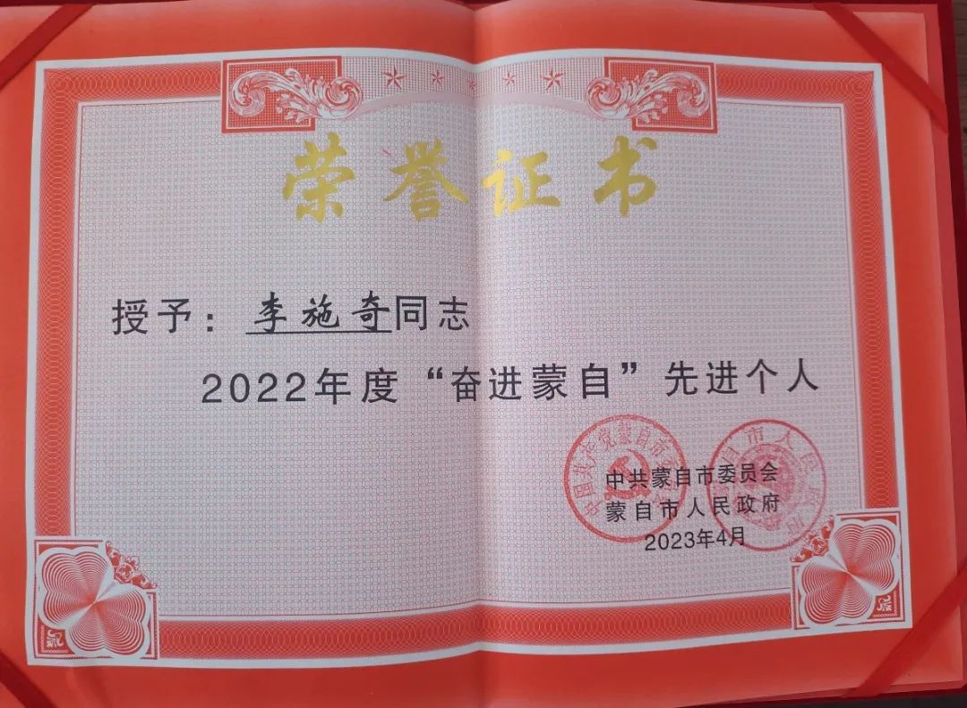 近日,蒙自市举办了“奋进蒙自”先进集体和先进个人表彰晚会,会上宣读了《中共蒙自市委 蒙自市人民政府关于表彰蒙自市“奋进蒙自”先进集体和先进个人的决定》,其中蒙自市人民检察院李施奇同志荣获蒙自市“奋进蒙自”先进个人奖。