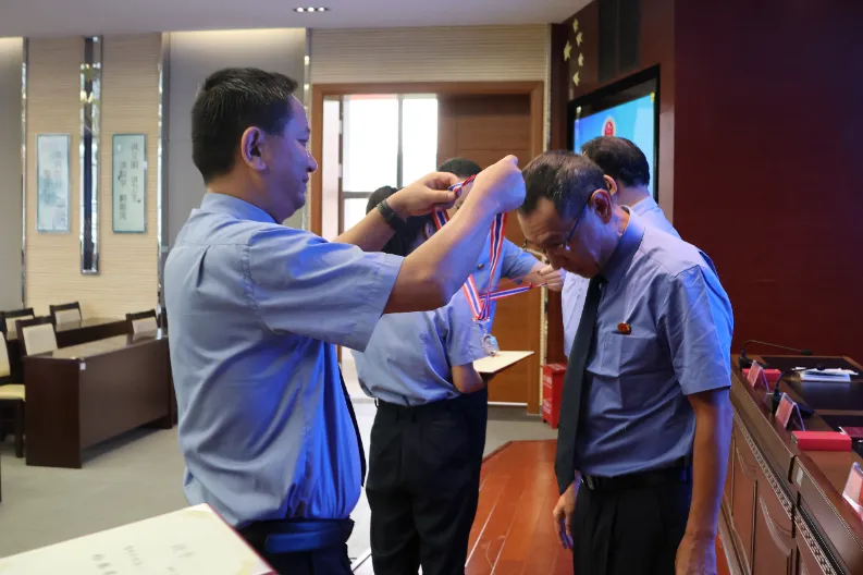 在热烈的掌声中,党组书记、检察长毛雪峰和党组副书记、副检察长冯应伟为两位同志颁发了闪耀的检察荣誉章和荣誉证书。这沉甸甸的荣誉不仅是对两位同志三十年如一日辛勤付出的充分肯定,更是对全体检察干警的激励和鞭策。荣誉章上闪耀的光芒,映照着检察人对法治信仰的坚守,镌刻着对公平正义的追求。