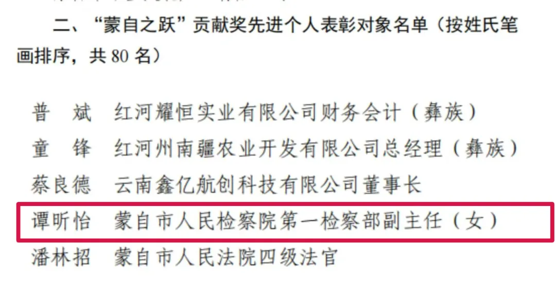 蒙自市人民检察院第一检察部副主任谭昕怡同志荣获“蒙自之跃”贡献奖先进个人称号。