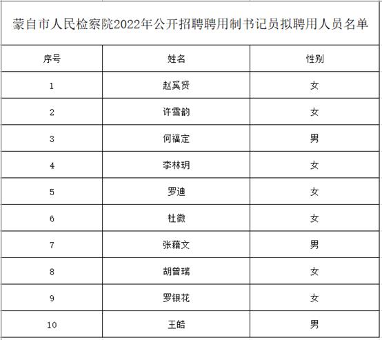 关于蒙自市人民检察院2022年公开招聘聘用制书记员拟聘用人员的公示
