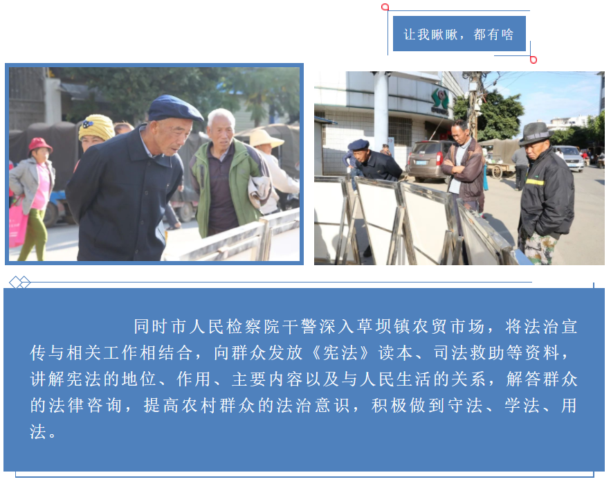 近日,在第七个国家宪法日来临之际,蒙自市人民检察院副检察长管陈安带领第四检察部的干警协警们来到草坝,为村民开展以“学习习近平法治思想,强化新时代法律监督”为主题的法治宣传教育活动,让更多普通群众走进检察机关,学习领悟习近平法治思想,了解和参与检查工作,感知法治的力量。